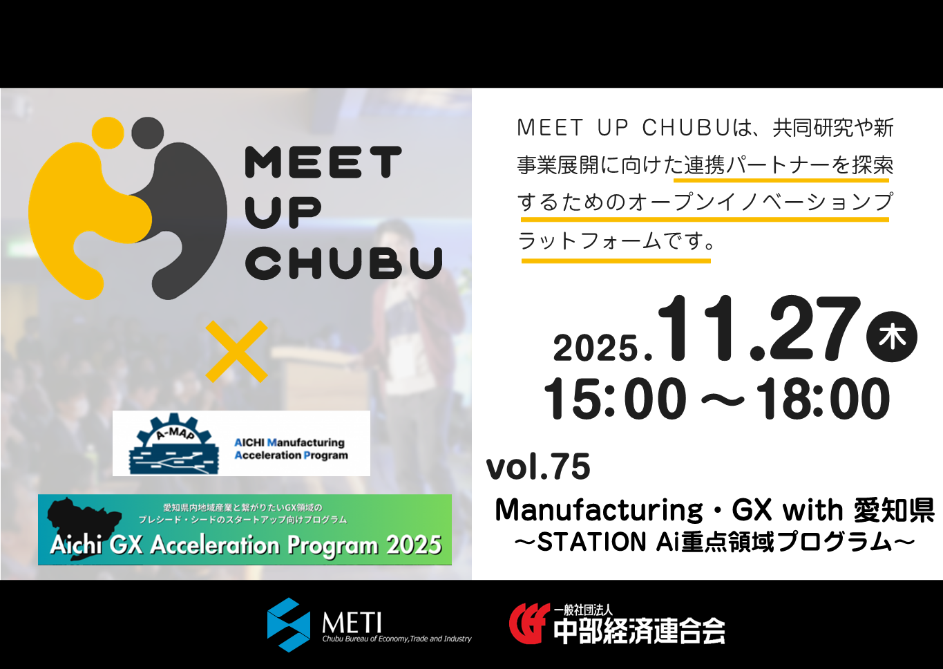 ・内 容 今回のMeet up ChubuのテーマはGX。社会実装を目指すベンチャー企業による、GX・製造業分野の技術連携を探るピッチが行われます。是非、皆様の御参加をお待ちしています。