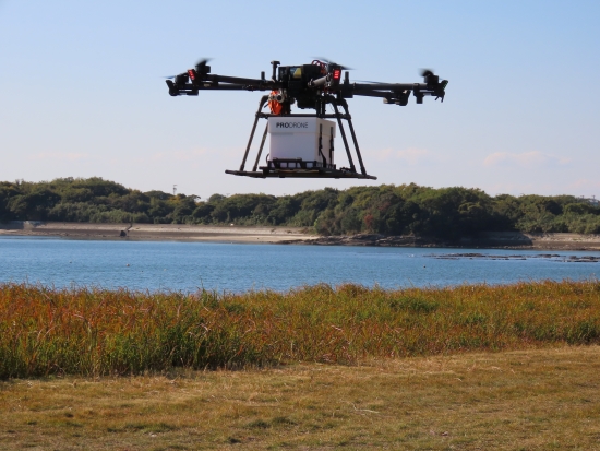 海浜公園および東港集落にて、一色港から出発したドローンが運んだ荷物を海浜公園で回収、搬送ロボットに荷物を移し、道幅が狭い個人宅まで荷物を搬送する様子を見学