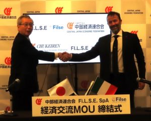 中経連はイタリア・リグーリア州※政府と連携して経済発展を担う地域開発機関「リグーリア州経済開発金融公社(FI.L.S.E./Finanziaria Ligure per lo Sviluppo Economico)」と経済交流に関する覚書(MOU)締結式を名古屋市内にて開催。勝野会長とジェロラモ・タッコーニャ会長が覚書に署名した。