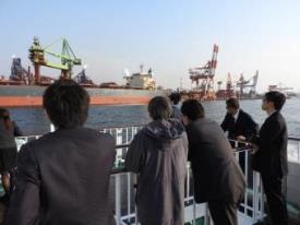 見学会は、国土交通省中部地方整備局と名古屋港管理組合のご厚意により実現したもので、港内全体を把握するために、参加者は船に乗り、各埠頭の特徴やコンテナターミナル、高潮防波堤の嵩上げ完了箇所などを視察した。参加者からは「通常では体験できない船からの視察で、名古屋港の役割が勉強でき、かつ貴重な経験をすることができた」といった声が相次ぐ等、名古屋港の物流・防災機能について理解を深めた。